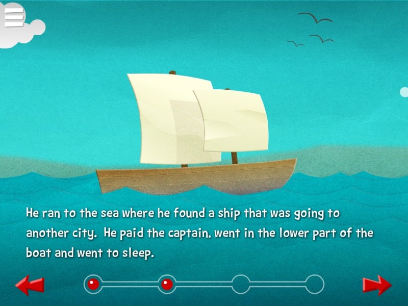 This interactive book will have basic page navigation with timed animation on each page that retells the story of Jonah. Story is told through awesome animated scenes that are animated per page. Each page will feature interactive objects that children can press on and look at and listen to. The book will also have a save feature where you can pick up from where you left off, and also a progress tracker. Children can also look for objects they can collect in each page that are hidden. The narration feature will allow the parents to record their voice while reading through the book and the children can play it back anytime.
